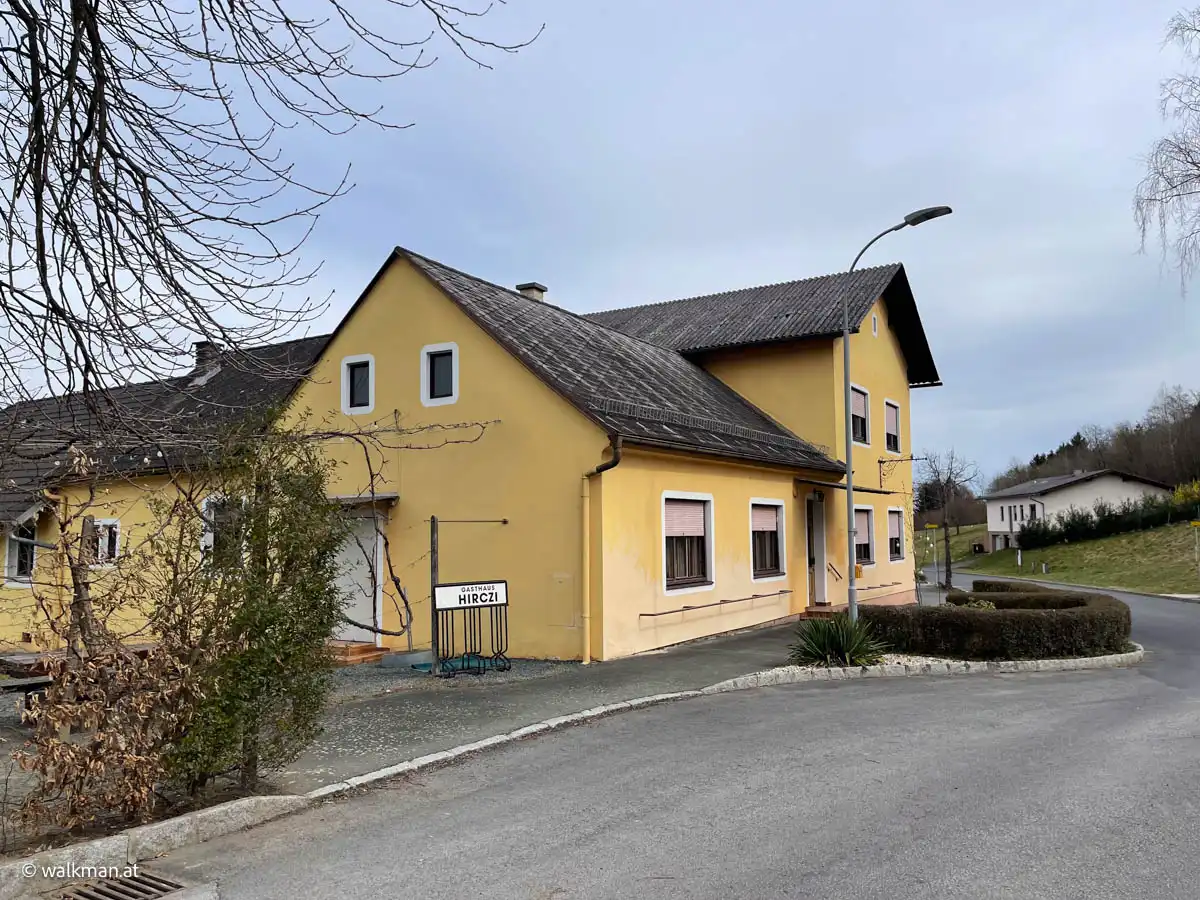 Die letzten paar Meter wandere ich am Gasthof „Hirczi“ vorbei. Dieser scheint auch keinen Gast mehr zu bedienen. An der Fassade kann man noch erkennen, wo einst die Kästen der Speisekarte montiert waren. Aber die abblätternden Fensterrahmen bekunden den beginnenden Verfall des Wirtshauses, dass sicher einmal Schauplatz vieler kleiner und größerer Feste war. Schade eigentlich, wenn man bedenkt, wie viele Menschen sich hier sicher regelmäßig getroffen und Spaß gehabt haben.