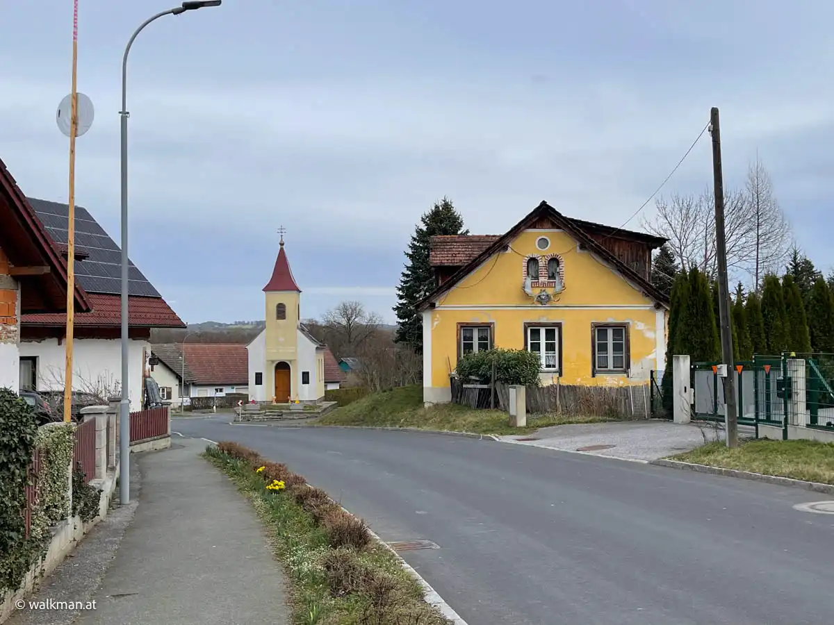 Ein Parkplatz in der Nähe der Kirche des Ortes war schnell gefunden. Hier, am quasi Hauptplatz, ist eine kleine Parkbucht am Straßenrand, die mich auch bei anderen, bisher gegangenen Touren hier nie im Stich gelassen hatte. So auch heute. Und los ging meine Tour. Laut Webtool waren heute auf knappen 4 Kilometern 106 Höhenmeter zu überwinden.