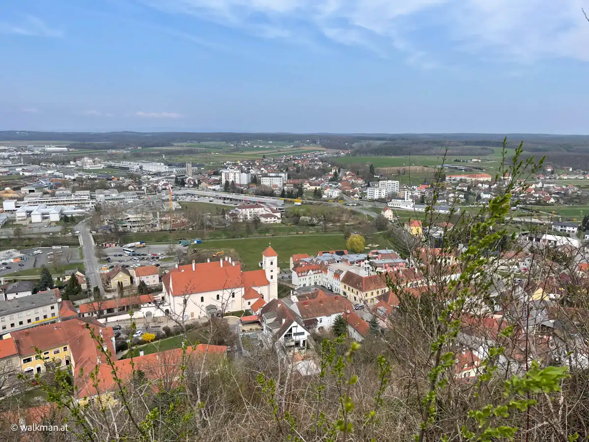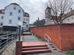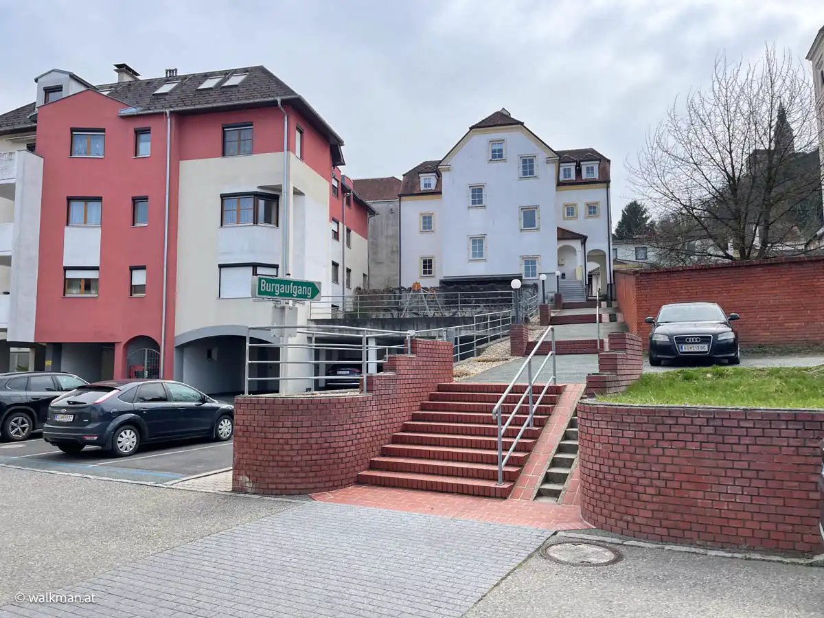 Also startete ich vom Parkplatz weg. Zunächst die Schulstraße nach vor bis zur Grabenstraße. Hier hielt ich mich nun links und spazierte etwa 100 Meter nach vor, bis zu den Stiegen, die ins Zentrum hinein führen.