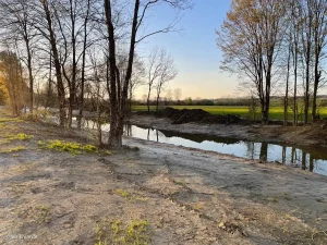 Und hier hat sich einiges getan, seit ich das letzte Mal hier gewandert war. Auf der gesamten Länge des Teiches war hier, links neben dem Weg, der Uferbereich des Entlastungskanals neben dem Teich, neu gestaltet worden. Und das nicht wenig. Da wurde mit schwerem Gerät gleich ein ganz neuer Verlauf ausgebaggert.