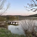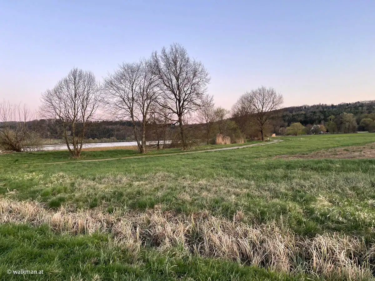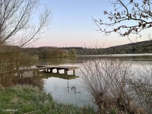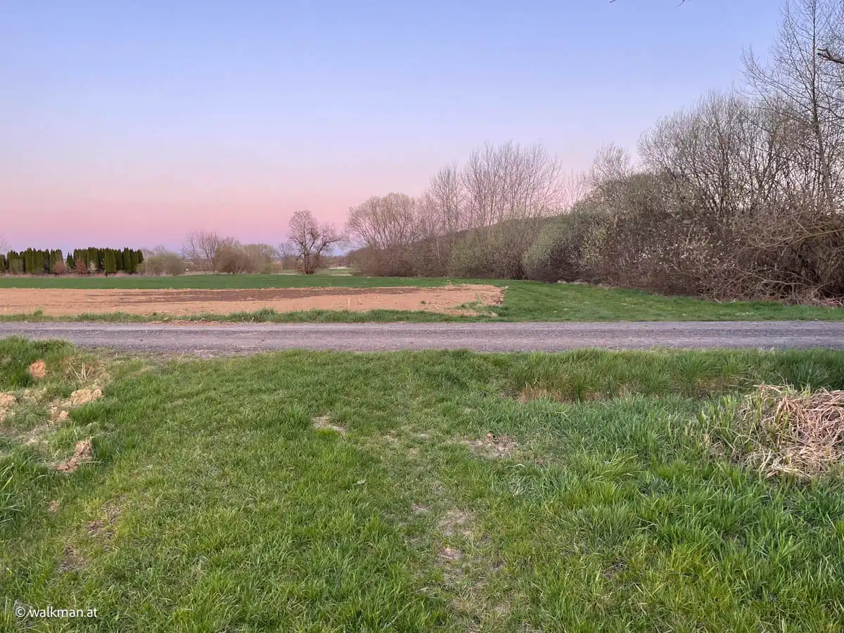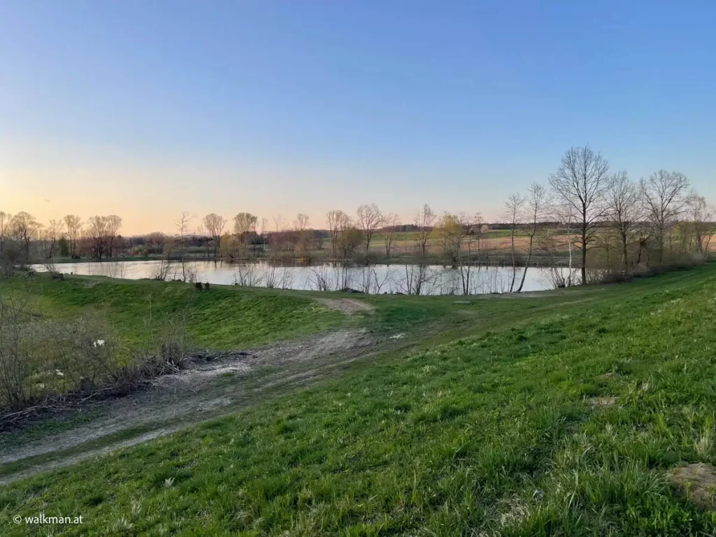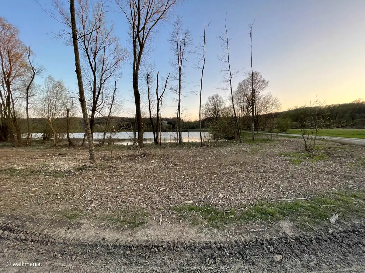 Bei etwa Streckenkilometer 3, trete ich dann aus dem Wiesenweg heraus, auf den Schotterweg, der um den Fischteich führt. Hier halte ich mich links und spaziere den Uferweg, wie schon so oft, weiter entlang. An der Schranke, dem Steg und dem Bootshaus vorbei und an der Siedlung entlang die hier links hinter dem Hügel versteckt liegt.