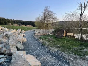 Start dieser Runde über die beiden Fischteiche, hinter dem Badesee, ist am Parkplatz des Fischteichs. Hier ist, im Normalfall, genügend Platz für das Auto. So auch heute. Also raus aus dem Auto und rein ins „Vergnügen“. Links weg vom Parkplatz führt meine Route zunächst am Ufer des Teichs entlang, nach hinten.