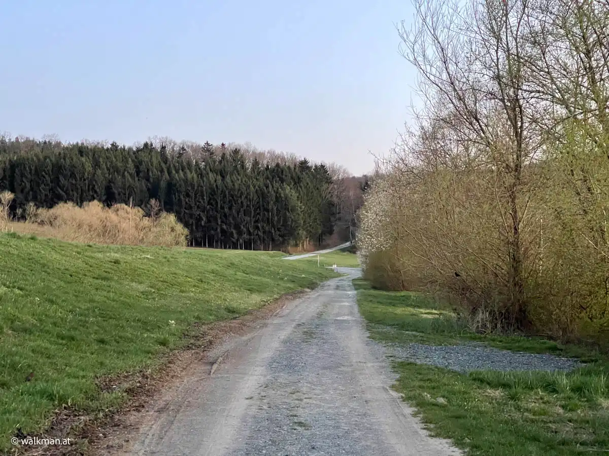 Mittig, zwischen den beiden Teichen überquere ich einen bekannten Schotterweg, den ich auch bereits gegangen war, und wandere abermals am südlichen Stück des Wiesenwegs weiter. Jetzt konnte ich schon den großen Fischteich sehen. Ich lag also richtig mit meiner Vermutung.