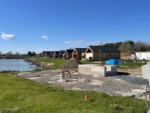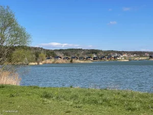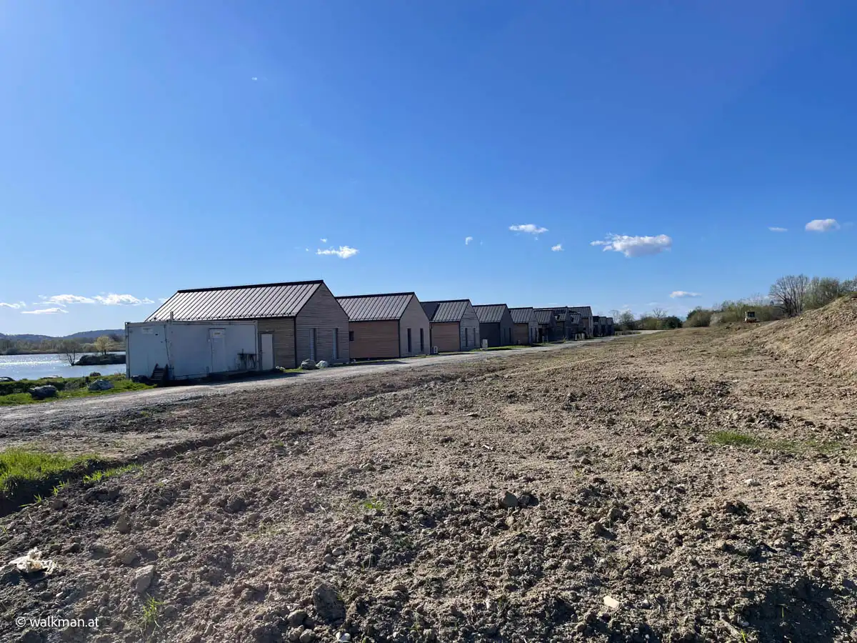 Wir wandern nun die Gasse runter. An vielen neu errichteten und großteils bereits bezogenen Bungalows vorbei. Zwischen den Häusern ergattern wir immer wieder einen Blick auf den Badesee. Und nach etwa 40 Minuten sind wir wieder beim Auto angekommen.