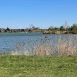 Mit einem kleinen Sprung, bzw. Hüpfer, über einen Entwässerungsgraben setzen wir in die Gasse über, um dem Wasser des Sees näher zu sein. Und natürlich sind eventuelle Fotos von hier aus auch viel schöner. Und begegnen einem Pärchen, dass offensichtlich gerade mit seinem Hund Gassi geht.