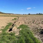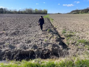 Heute aber nicht. Wir stehen nach einem Stück weit Wiesenweg, samt Wind von der Seite, und nach knapp 30 Minuten Wegzeit, oder 1,7 Kilometer am Ende des Weges. Ringsum nur Felder. Aufgeackert. Mit großen Schollen. Aber zumindest sehe ich in etwa 50 Metern Entfernung den Anschlussweg weiter führen. Was nun folgt, ist klar: Am Feldrand über die Schollen balancieren bis zum nächsten Weg.